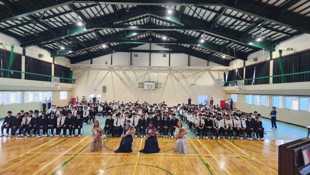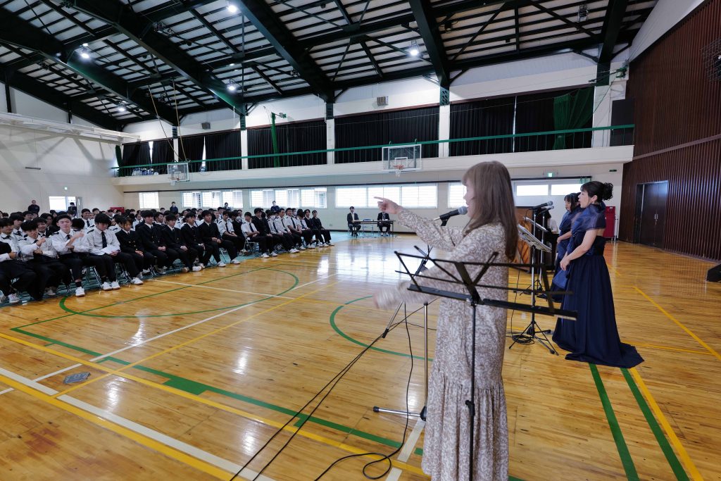 京都府立海洋高等学校での「こころの講演会」に作詞家の鮎川めぐみさんとミュージックアンサンブルVIVO(ヴィーヴォ)が出演しました。こころの講演会では全校の皆さんと一緒に、歌を通して人権の大切さについて考えました。ステージでは、鮎川めぐみさんから人権啓発イメージソング「世界がひとつの家族のように」を作詞した経緯をご説明いただきました。VIVOのミニコンサートでは、子を持つ母親の視点から命の大切さについてお話しいただいたり、音楽を通した心のつながりについてお話しいただき、「日本の歌メドレー」「翼をください」「遠い日の歌」「明日への手紙」「いのちの歌」などを歌っていただきました。ステージの最後には鮎川さんによる手話のレクチャーの後、会場の皆さんと一緒に「世界がひとつの家族のように」を手話を交えて歌いました。